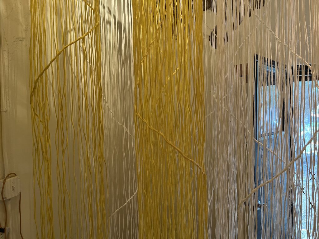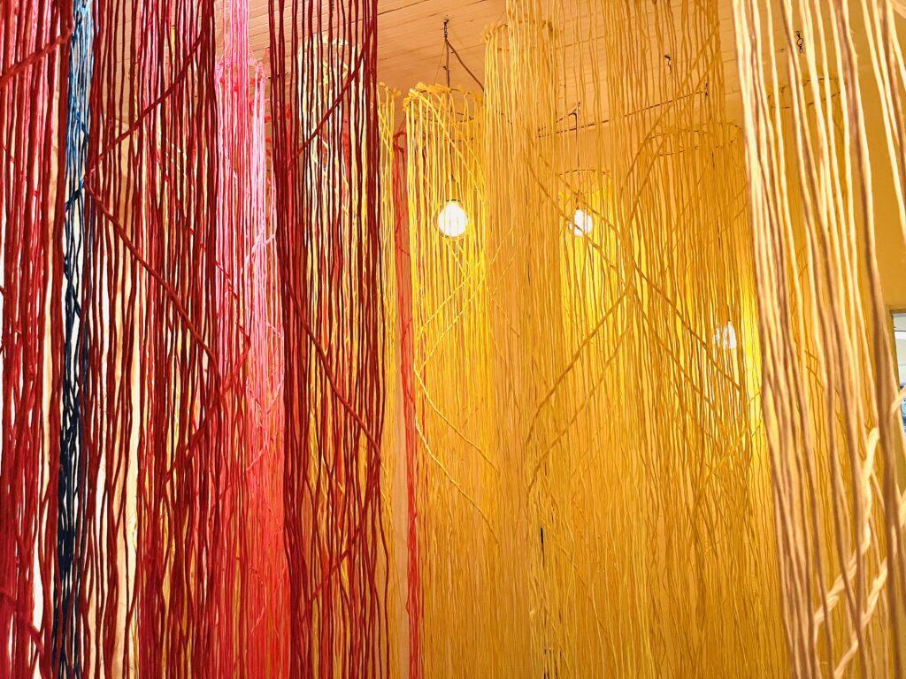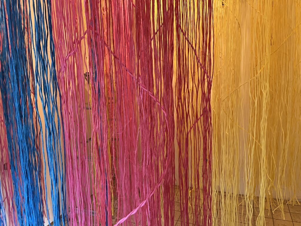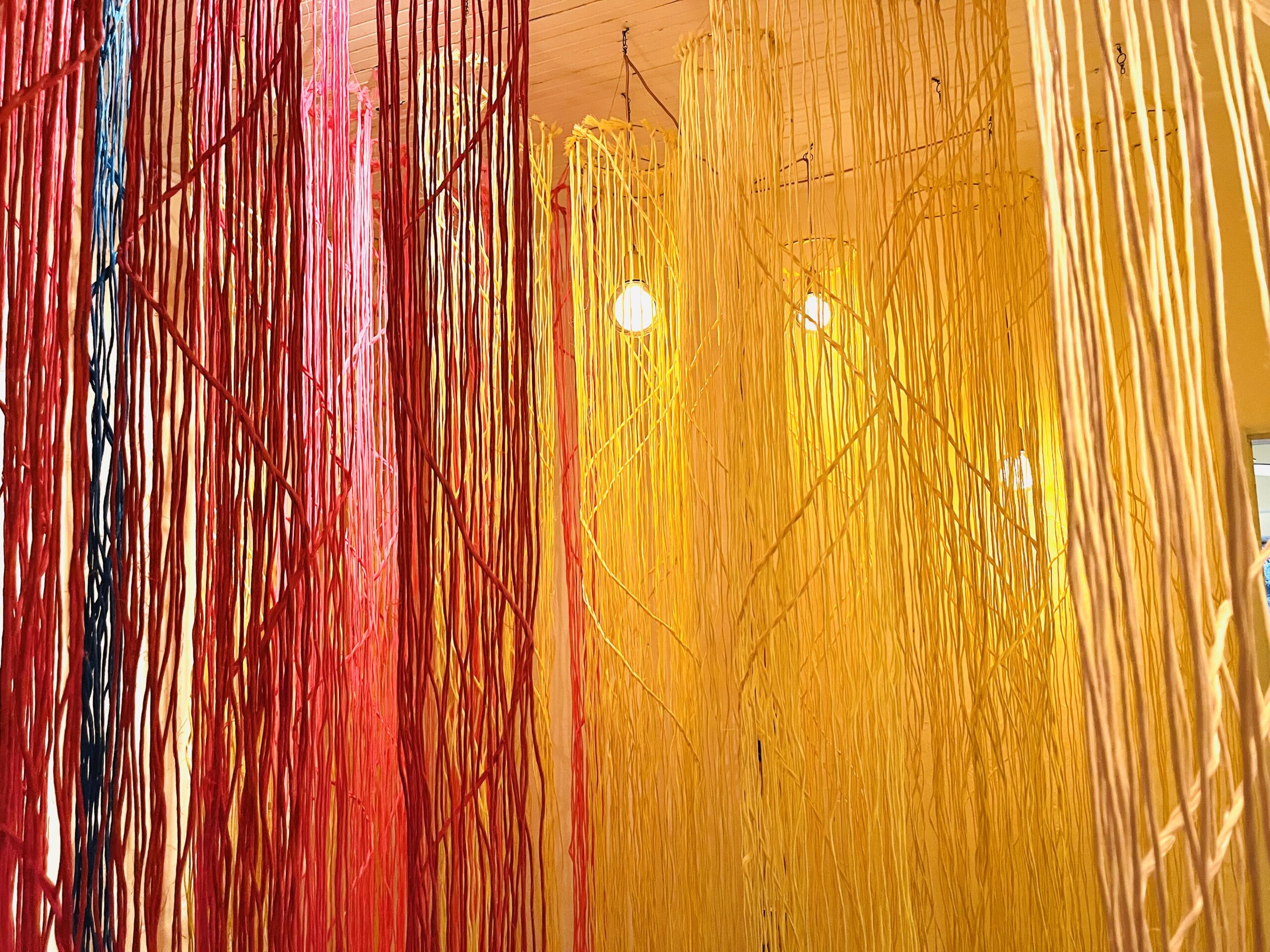 The map is a walk-through environment built out of ‘moments’ spent in each state of consciousness. Each moment is represented by a columnar mobile with delicately woven spirals that rotate gently as participants walk through. Each state is a different color, design, and size crafted out of organic 4mm single strand cotton cord.