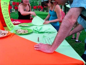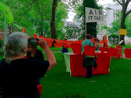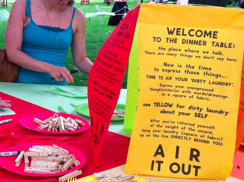 Each participant was invited to share an unexpressed story or thought and ‘air it out’ on the 20 foot square of suspended laundry line surrounding the main stage of the installation: the dinner table. This place is one of the main stages of social interaction, and a great gathering spot for strangers to express deep-seated sentiments. Or random thoughts.